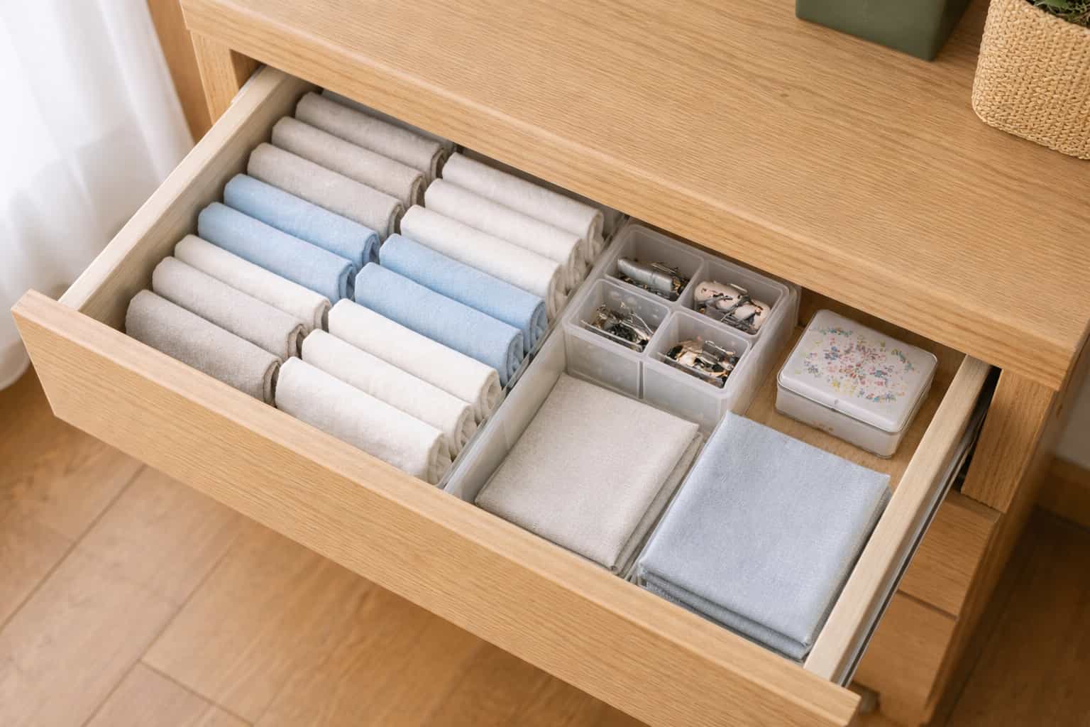 引き出しを整えるときは、布類の列と小物の置き場を分けるだけでも印象がかなり変わってきます。