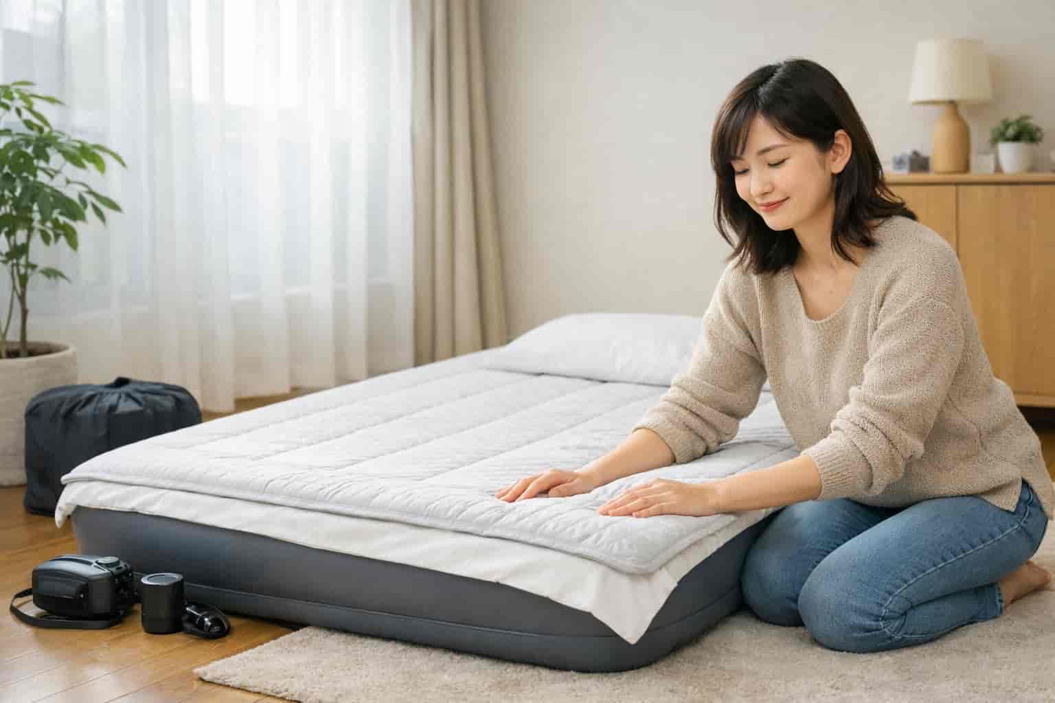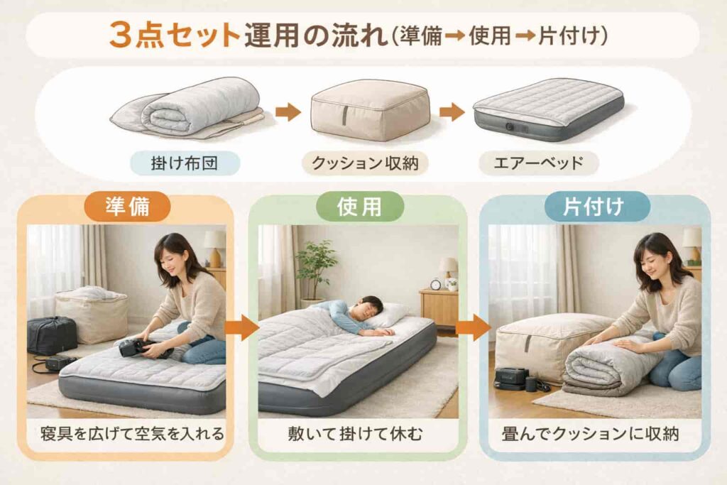 敷きはエアーベッド、掛けは薄掛け、さらにクッションケースで置ける収納にする流れを、初心者向けの言葉で紹介します。