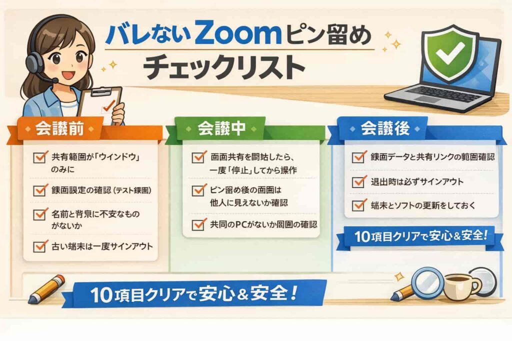 チェックリスト:バレない運用10項目(会議前・会議中・会議後)