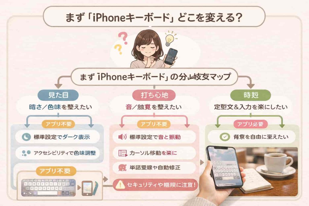 キーボードが見づらい、打ちにくいと感じたら、まずは「見た目」「打ち心地」「時短」に分けて整理すると、次に何をすればいいかが見えてきます。