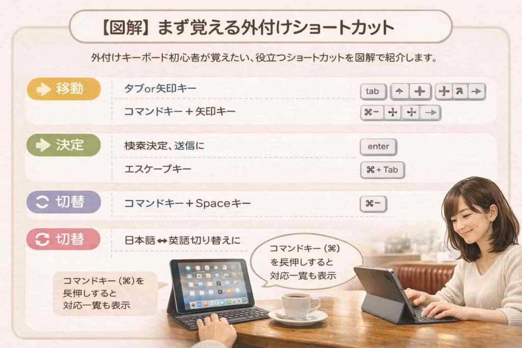 iPadや外付けキーボードを使う人向けに、切替の考え方やショートカットの入口も紹介します。