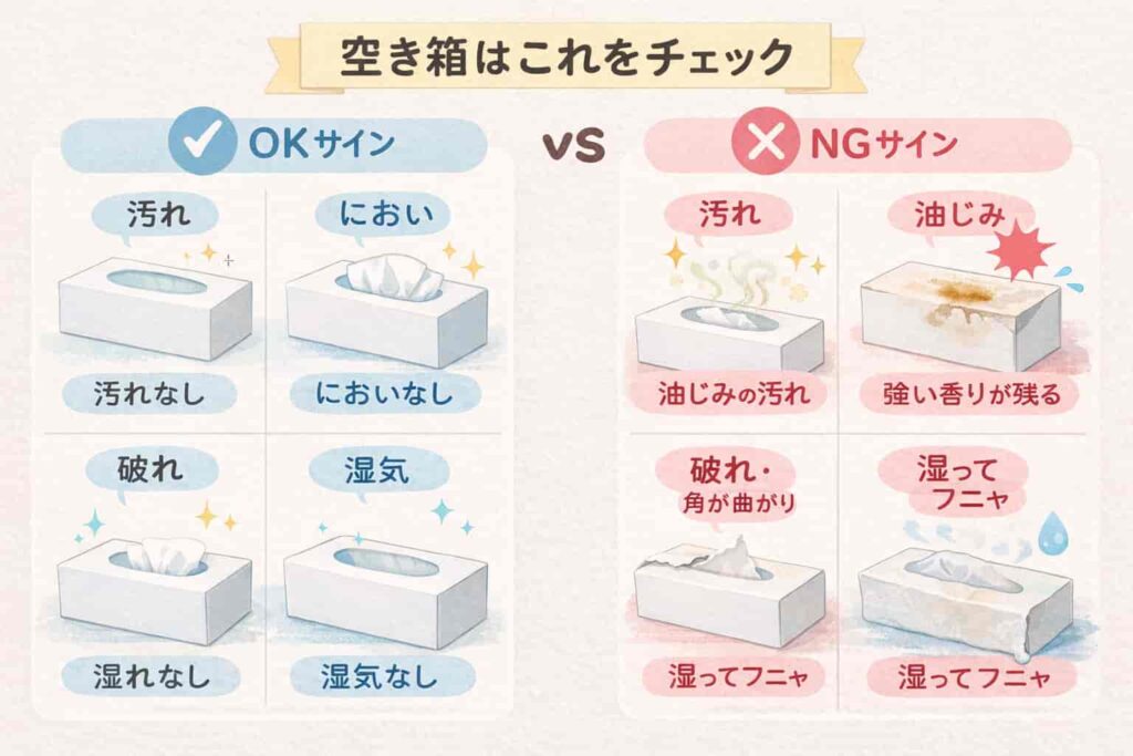 たとえば油じみがある箱や、香り付きティッシュの強いにおいが残る箱は、収納した物にも移りやすいので見送ったほうが安心です。