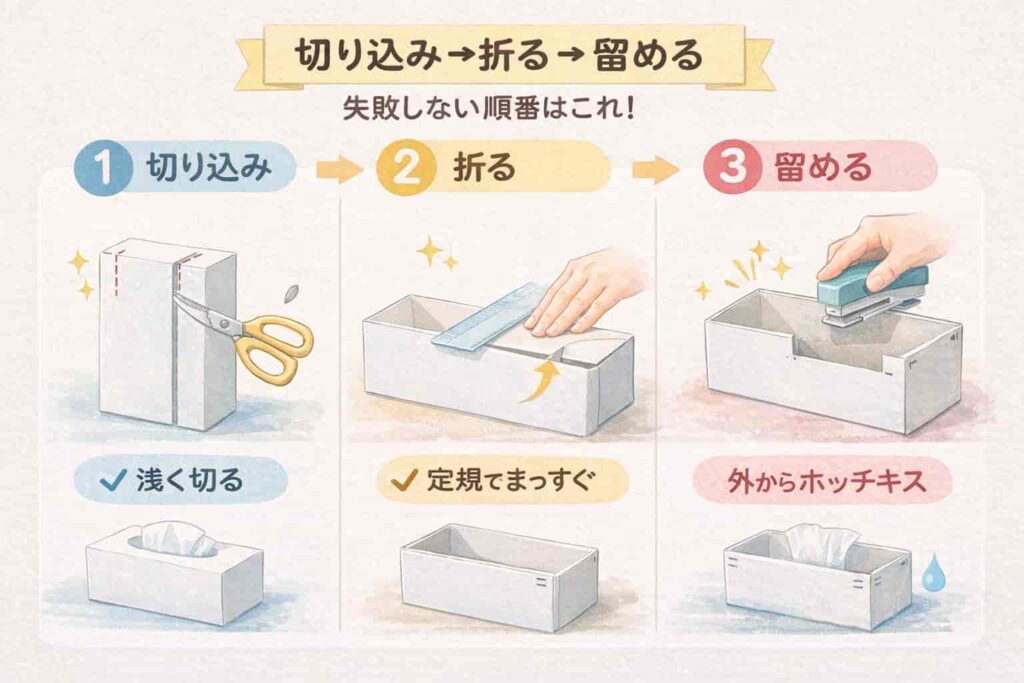 次に、ハサミとホッチキスとテープだけでできる、切り込み→折る→留めるの最短手順を図解のイメージで説明します。