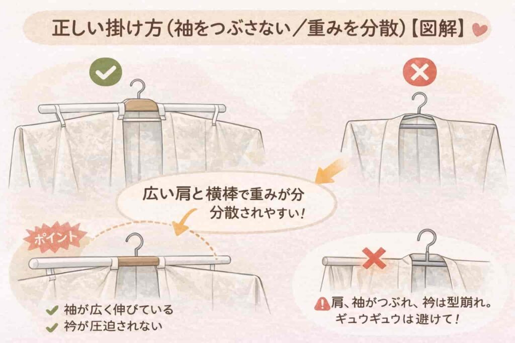 帯を結んだまま掛けると重さが増えるので、先に外しておくと形が崩れにくくなります。