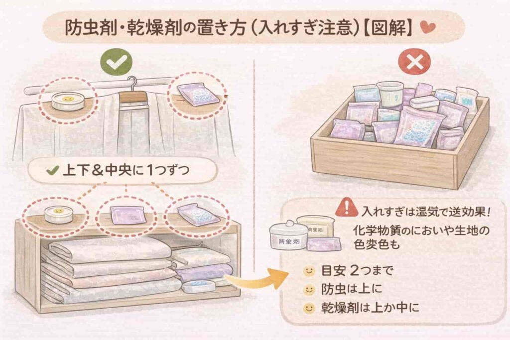 防虫剤や乾燥剤を入れる場合は、種類を混ぜないことと、交換日を小さな紙に書いておくと忘れにくいです。